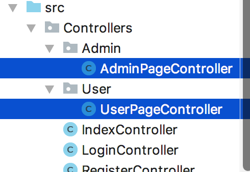 3、然后我们在 Controller 里创建两个子包,分别叫 Admin 和 User,里面分别放 AdminPageController 和 UserPageController,对上面的页面资源进行展示。